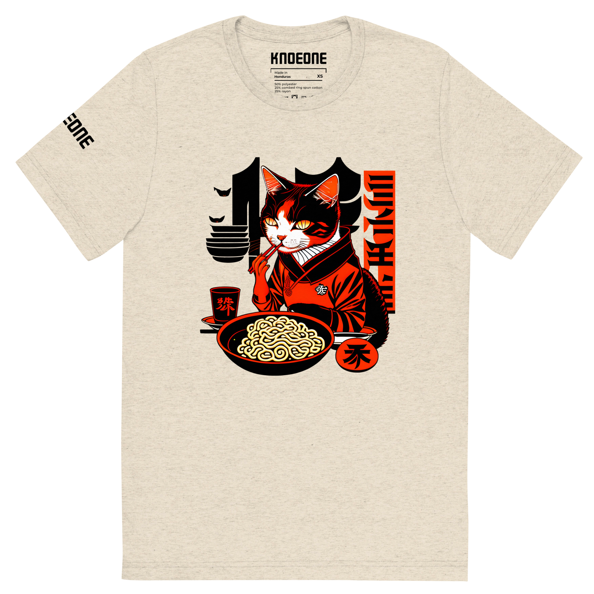 Once upon a time, there was a feline of great refinement and taste, who traveled to the bustling metropolis of Tokyo in search of the perfect bowl of ramen. This sophisticated cat can be found in all its glory on this beautifully crafted t-shirt. The tri-blend fabric provides a comfortable and vintage feel, while the fabric's extreme durability ensures that it will remain a cherished item for many adventures to come. Made from a combination of polyester, combed ring-spun cotton, and rayon, this shirt is the perfect addition to any storyteller's wardrobe.